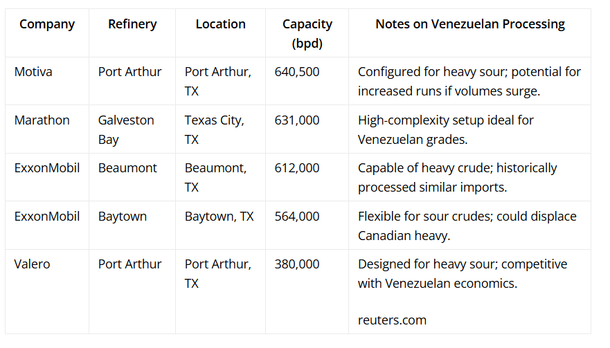 Venezuelan oil, known for its heavy and sour characteristics (API gravity around 16 degrees for benchmark Merey crude, with sulfur content of 1.5-2.7%), is ideally suited for complex Gulf Coast facilities equipped with coking units to convert it into higher-value products like gasoline, diesel, and jet fuel.
