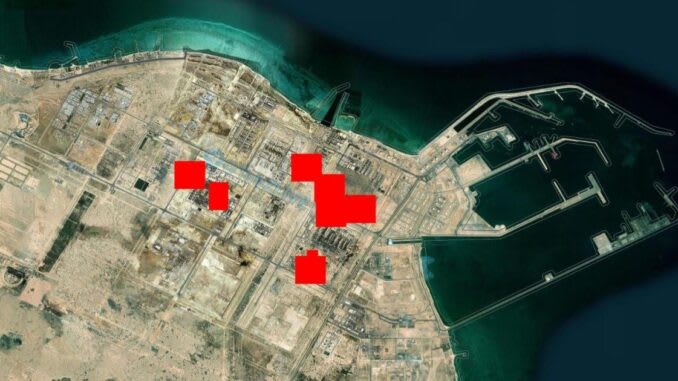 Each ASU features enormous cold boxes (470 tonnes each, standing 60 meters tall) manufactured primarily in Europe and China. The red boxes in the FIRMS imagery align precisely with the industrial footprint where these units and associated cryogenic infrastructure are clustered near the coastal process area of Ras Laffan.